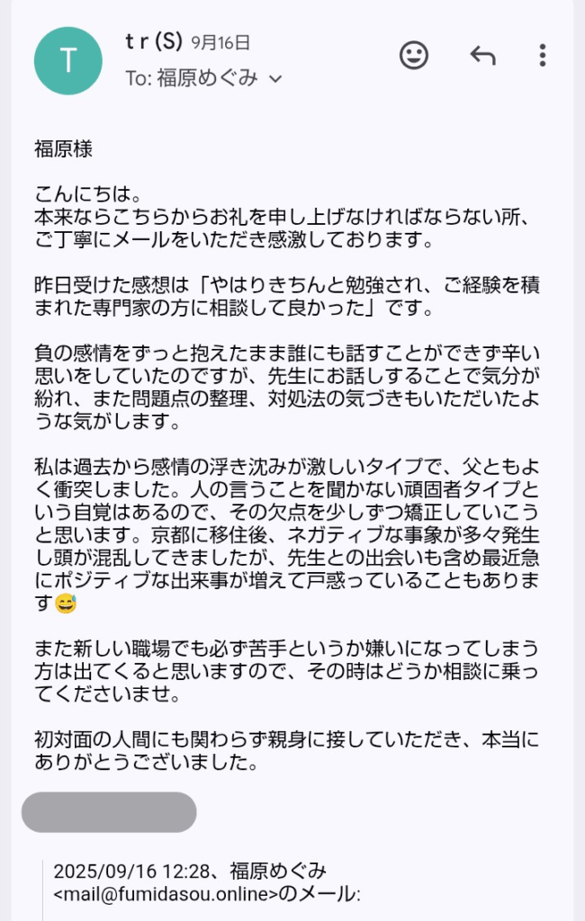 20代が経験する楽しいことで何一つ良い思い出がなく、仕事でもつらい記憶ばかり。自分にも自分の経歴にも自信が持てずにいました。一番心に残っているのは、福原先生が「しんどかったね、今日まで。私が自信の入り口まで連れていくよ。」と言ってくれたことです。私にこんな優しく真剣に関わってくれる人がいるんだ…と涙が出ました。