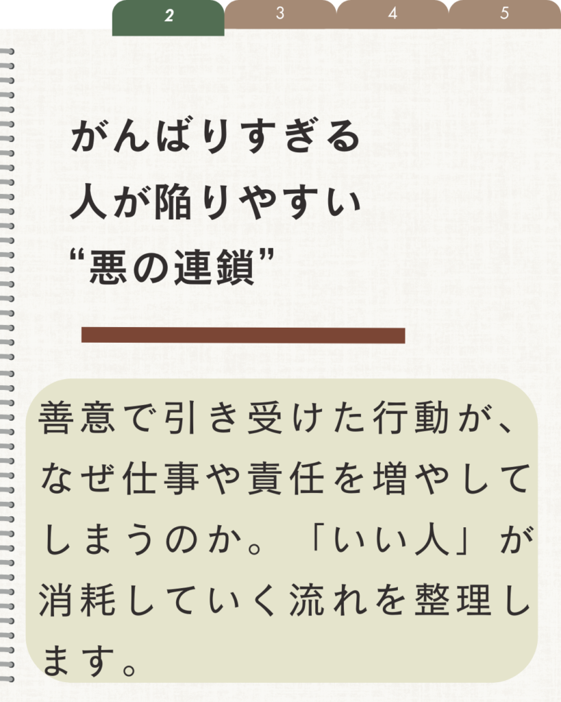 「いい人」をやめなくても、引き受けすぎない関係はつくれます。がんばり続けなくても、消耗しない関わり方へと、少しずつ移っていくことはできる。